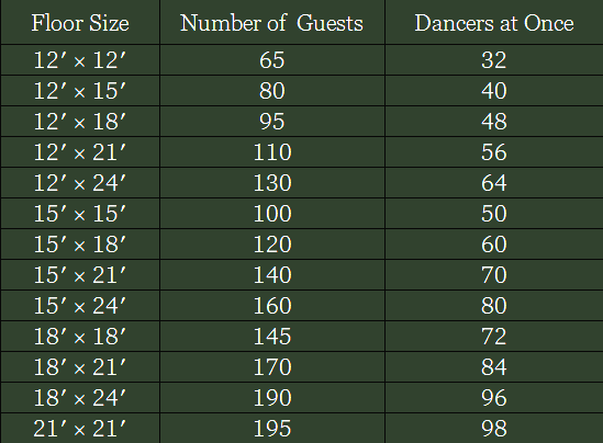 These recommended sizes assume approximately 50% of your guests will be dancing at once. Consider sizing up if you expect a lively crowd or need extra floor space for a DJ.