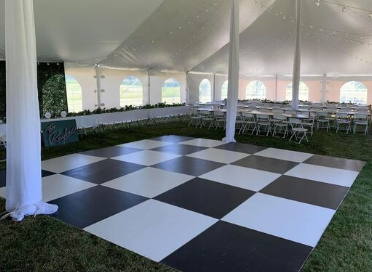 Our modular 3’ x 3’ interlocking dance floor tiles allow us to create custom dance floor sizes for weddings, tent receptions, and backyard parties of all sizes.